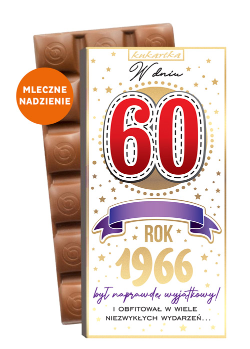 Czekolada prezentowa "Urodziny 60" CZK-549 - 100 g pysznej, polskiej mlecznej czekolady z delikatnym mlecznym nadzieniem, w eleganckim, prezentowym opakowaniu. Idealna na każdą okazję.