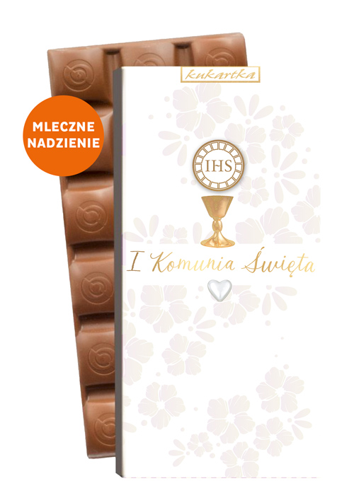 Czekolada prezentowa 555 Komunia - 100 g pysznej, polskiej mlecznej czekolady z delikatnym mlecznym nadzieniem, w eleganckim, prezentowym opakowaniu. Idealna na każdą okazję.