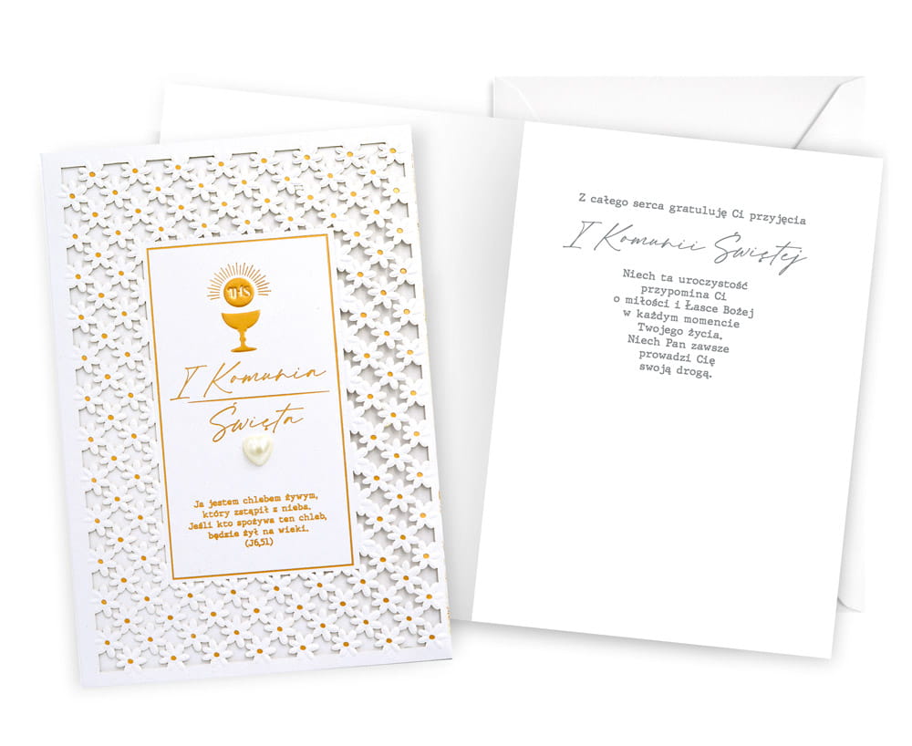 Kartka B6 z ozdobnej serii Dream Cards na Komunię - nieduża, ale robi wrażenie dzięki atrakcyjnej kolorystyce i ciekawym zdobieniom.