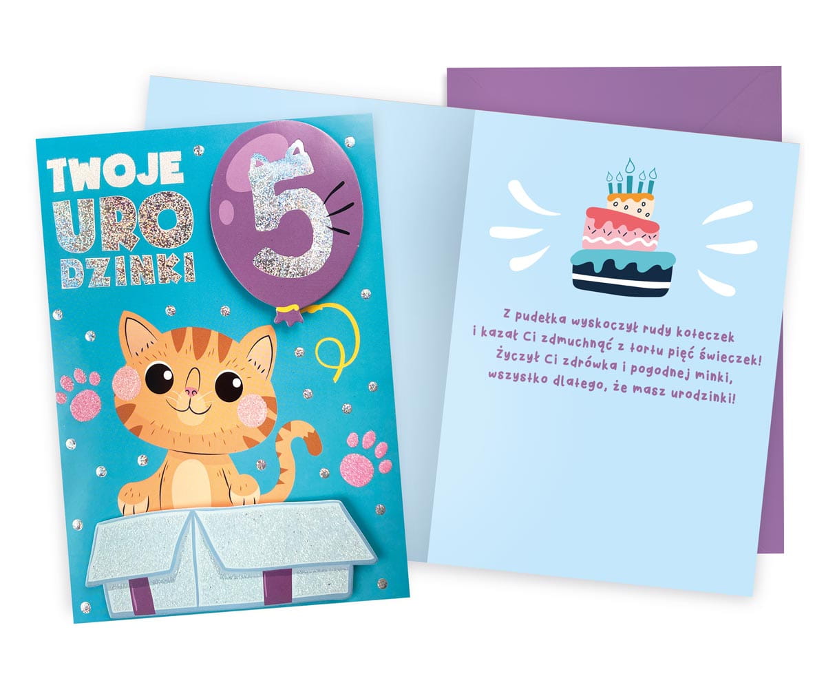 Karnet Dream Cards Plus "Urodziny 5" DKP-040 w powiększonym tzw. Angielskim formacie 140x190 mm. Kartka z ozdobnej serii Dream Cards Plus na piąte urodziny robi wrażenie dzięki atrakcyjnej kolorystyce i ciekawym zdobieniom.