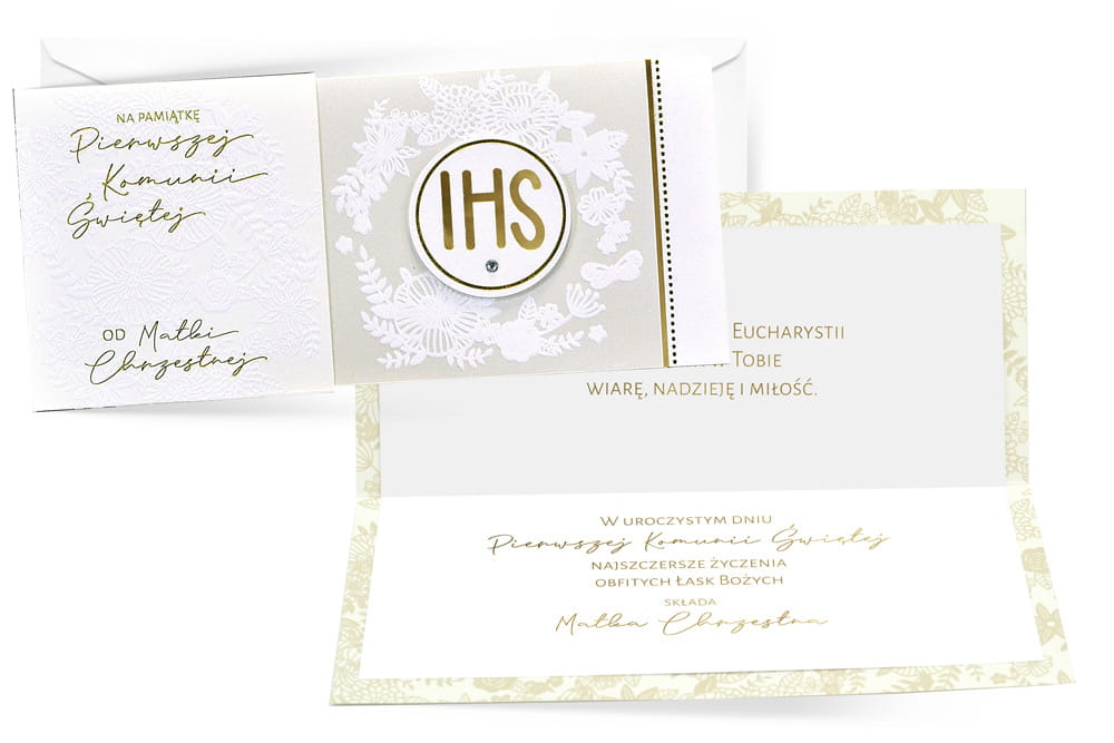 W środku każdej kartki znajdują się dobrane do okazji życzenia, a do kartki dołączona jest dopasowana koperta.