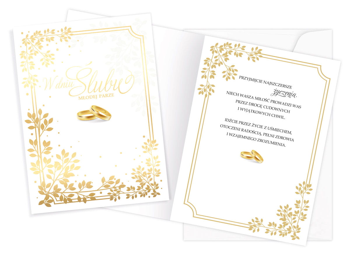 Wewnątrz znajduje się tekst życzeń, a całość uzupełnia dedykowana biała koperta.