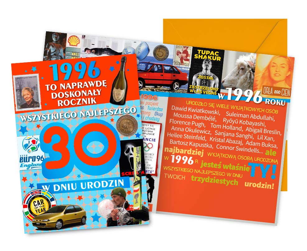 Kartka z serii To Był Rok, w której w środku i na froncie znajdują się ciekawe wydarzenia z danego roku. Wykonane z niezwykłą dbałością o szczegóły, zdobione folią holograficzną i w całości pokryte folią matową dla podkreślenia efektu prostoty i elegancji. Każdy karnet zawiera w środku starannie dobrane życzenia oraz dopasowaną kopertę.