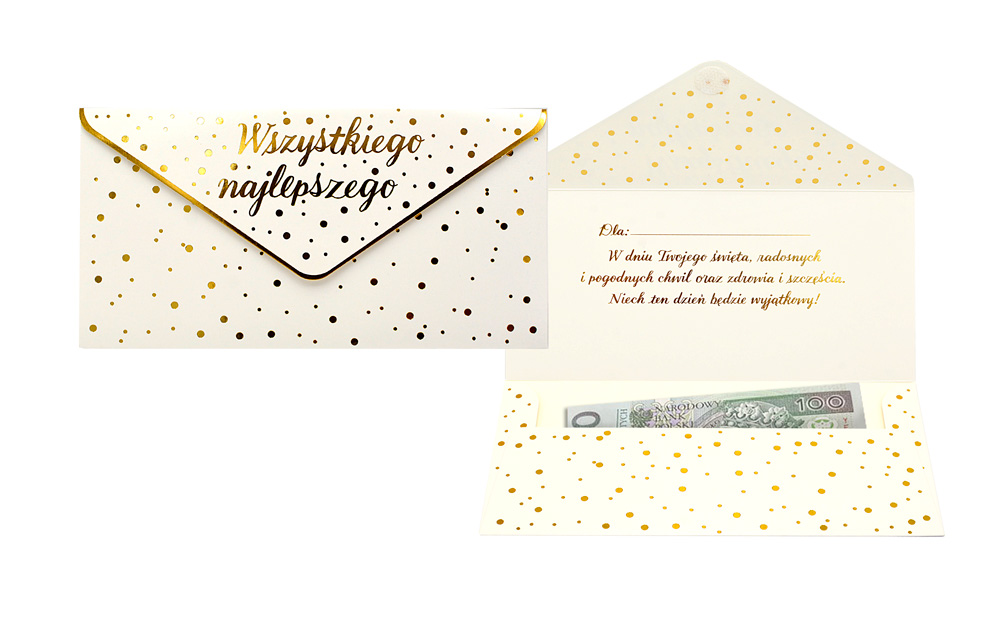 Koperta podarunkowa jest eleganckim sposobem na podarowanie bliskiej osobie banknotu lub karty podarunkowej. Koperta jest kolorowa i uszlachetniona metalizowaną folią hot-stamp, jest solidnie wykonana i wyposażona w rzep, co umożliwia jej wielokrotne otwieranie i zamykanie. Koperta zawiera życzenia w środku.