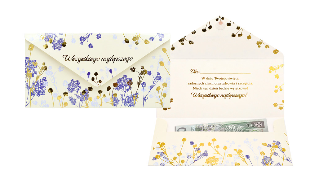 Koperta podarunkowa jest eleganckim sposobem na podarowanie bliskiej osobie banknotu lub karty podarunkowej. Koperta jest kolorowa i uszlachetniona metalizowaną folią hot-stamp, jest solidnie wykonana i wyposażona w rzep, co umożliwia jej wielokrotne otwieranie i zamykanie. Koperta zawiera życzenia w środku.