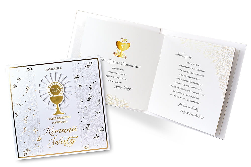 Książeczki PMB Q to produkt wyjątkowy - pięknie wydany, elegancki, zdobiony złotą oraz perłową folią, z kolorowym wnętrzem z pięknymi grafikami i cytatami oraz życzeniami i miejscem na osobistą dedykację. Na wewnętrznej stronie okładki wklejona jest specjalna, nieduża koperta, w której można przekazać kartę podarunkową lub banknot. Książeczka PMB Q Kukartka to idealny prezent na wyjątkową okazję, jaką niewątpliwie jest Pierwsza Komunia Święta.