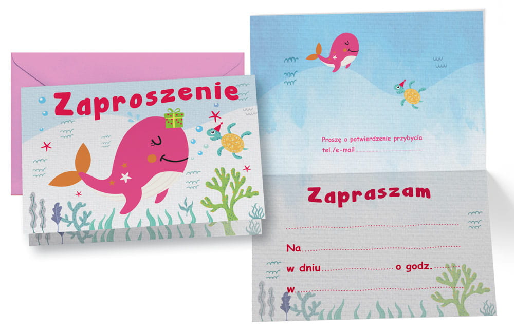 Opakowanie zawiera 5 sztuk zaproszeń z kopertami.